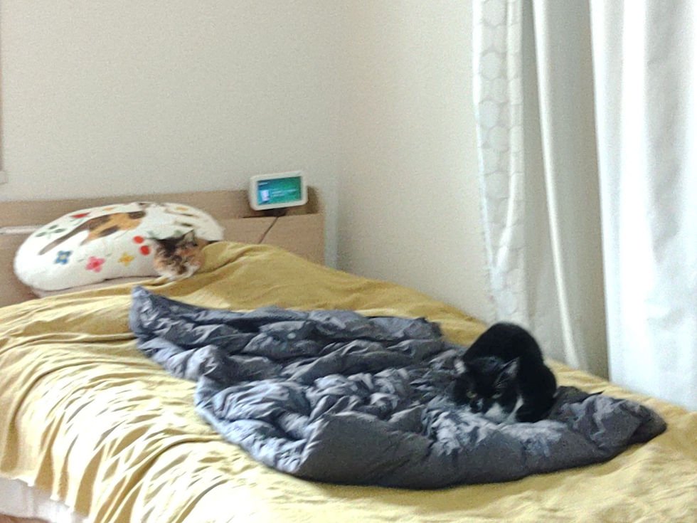 『ニャギちゃん』はベッドのお布団の中から、『うしちゃん』はベッド上に😸